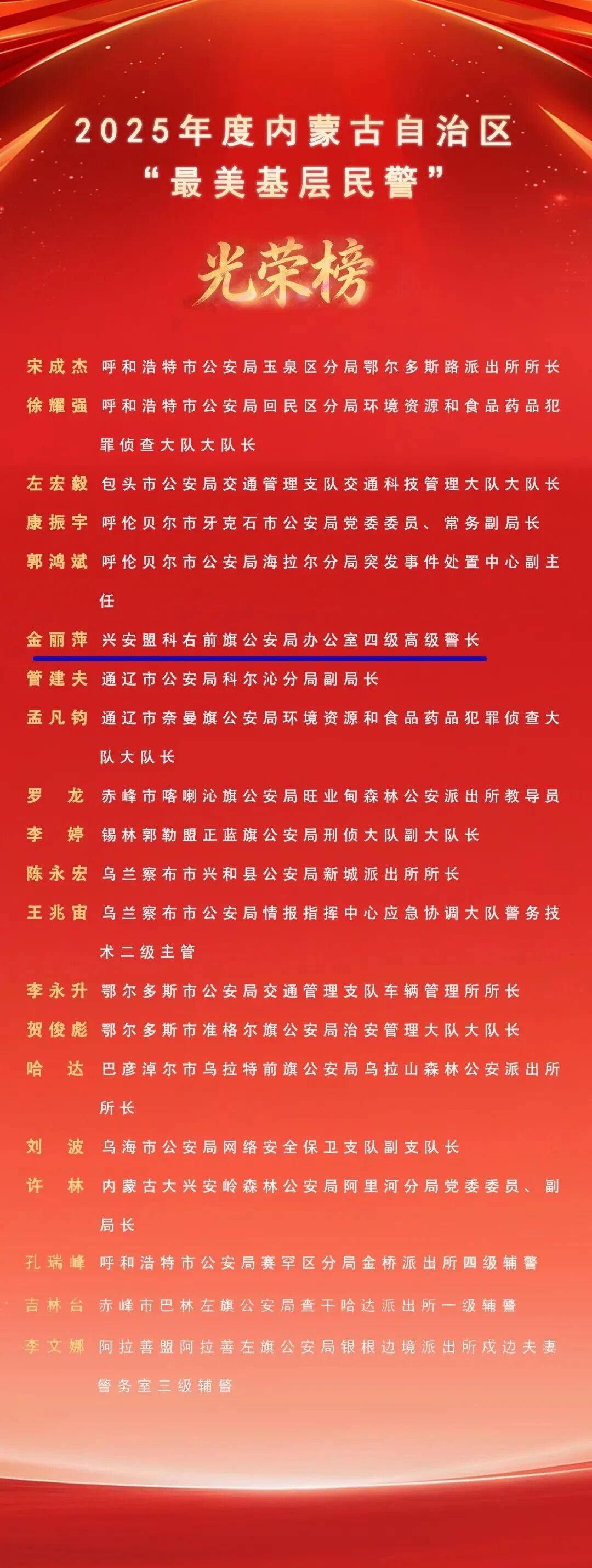 1月10日,“阳光下的守护”内蒙古公安机关庆祝第六个中国人民警察节主题宣传活动暨内蒙古自治区“最美基层民警”发布仪式在内蒙古广播电视台演播大厅举办。2025年度全区20名“最美基层民警”名单揭晓,多项“警察荣誉”同步颁发。继兴安盟扎赉特旗公安局图牧吉国家级自然保护区森林公安派出所所长金亮获得2025年度全国“最美基层民警”荣誉称号之后,兴安盟科右前旗公安局办公室四级高级警长金丽萍获得2025年度全区“最美基层民警”荣誉称号。