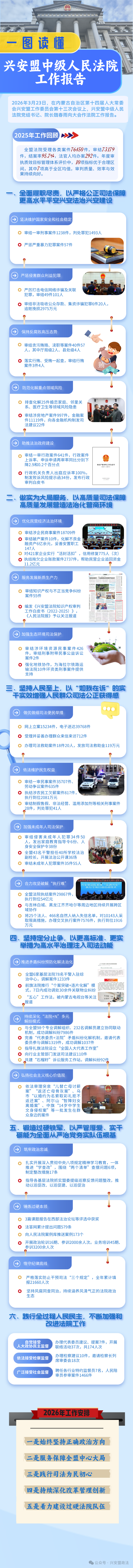 2026年,全盟法院将坚持以习近平新时代中国特色社会主义思想为指导,深入践行习近平法治思想,全面贯彻落实党的二十大和二十届历次全会精神,认真落实习近平总书记对内蒙古系列重要讲话重要指示精神,聚焦铸牢中华民族共同体意识这条主线,坚决贯彻落实自治区党委“1571”工作部署、自治区党委政法委“1147”工作思路、自治区高院“两坚持两攻坚两贯通”工作部署、盟委“七个彰显新作为”工作要求和行署“12843”落实举措,不断加强新时代审判工作,做深做实为大局服务、为人民司法,以更实举措、更优效能履行司法职责,为兴安盟实现“十五五”良好开局提供更高水平的司法服务和坚强司法保障。